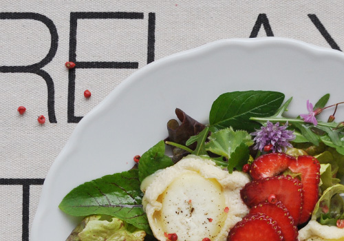 Yesterday, with some friends over, we made a quick summery dinner. We collected (wild) herbs and blossoms around the house, made a salad dressing with balsamic vinegar, vanilla sugar and olive oil, warm goat cheese, strawberries and pink pepper. Perfect for warm days that are spent outside mostly.