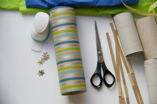 Schere, Lineal, Seidenpapier- und Geschenkpapierreste, Bänderreste, Heißklebepistole, Toilettenpapierrollen, doppelseitiges Klebeband, und Cracker Snaps (die gibt es z.B. hier, Lieferung dauert ca. 4 Tage).