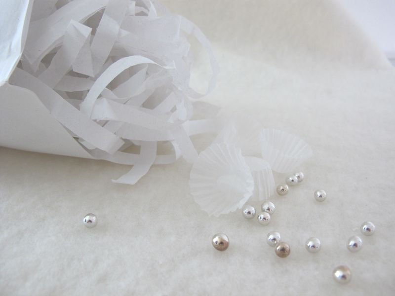 Winzige Papiertörtchen von Pralinen mit goldenen und silbernen Liebesperlen gefüllt bilden die Blütenkelche der freihandgestickten Silberblumen.