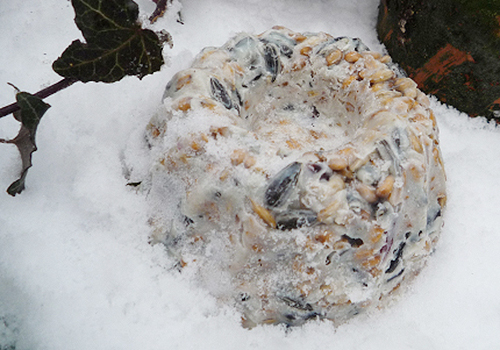 Ein Guglhupf für uns und ein Guglhupf für die Vögel. Einfach die Masse vom Rezept für Meisenringe in eine Silikon-Guglhupf-Form füllen und fest werden lassen. Das Ausfetten kann man sich sparen.